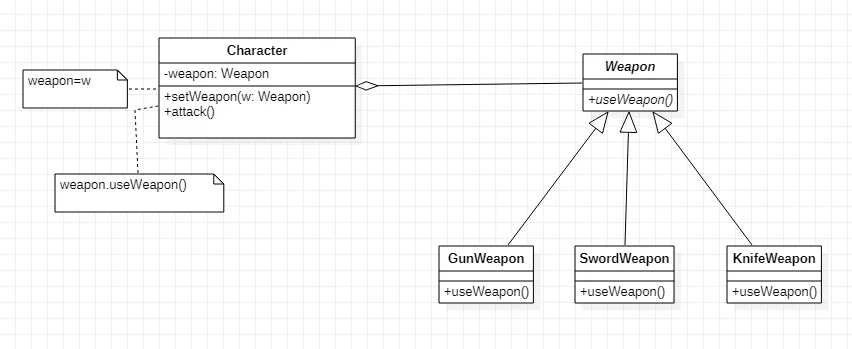 Giả sử mình muốn viết con game nhập vai, trong game có nhiều loại vũ khí (súng, kiếm gỗ, thần kiếm, đũa phép thuật, blabla…). Và tất nhiên nhân vật có thể sử dụng vũ khí nào tùy ý. Trong quá trình chơi, nhân vật cũng có thể thay đổi vũ khí.